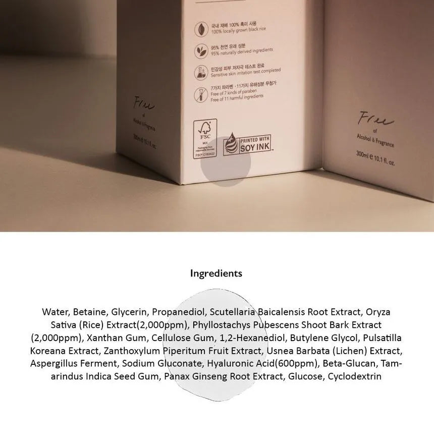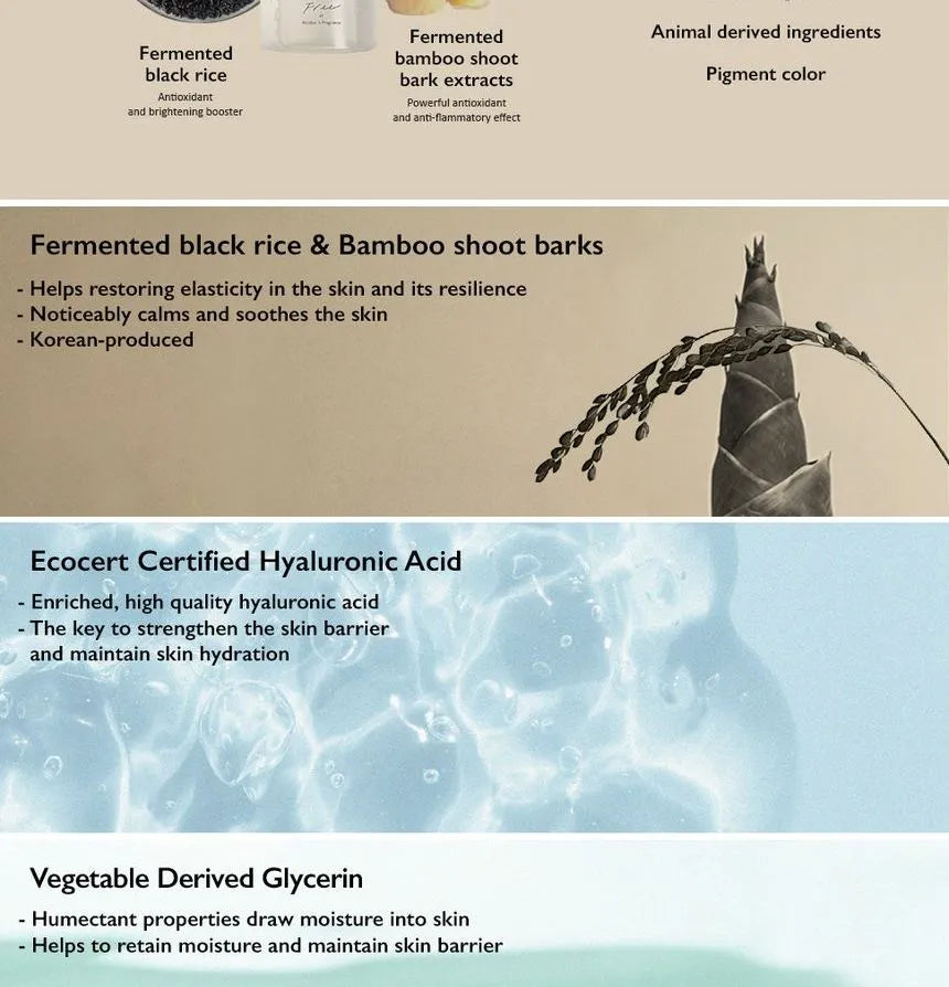 Fermented Black Rice (Oryza Sativa) Extract, Hyaluronic Acid, Bamboo Shoot Bark Extract, Beta-Glucan, Red Ginseng Extract, Betaine.
